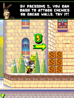 Shrek The Third The Movie The Game was clearly optimized for mass appeal, so it does this. left/right to move, up to jump, down to crouch (press while airborne to ground-pound; hold and press a direction while on ground to roll) and action to attack are the only inputs. there's nothing on the softkeys or *,0,# and you never need to hit two buttons at once. this is as simple as it could be, and yet you're still given tons of health, tons of grace time, tons of space to see and react to enemies, and in fact, the action button is optional.