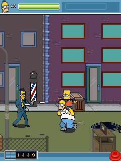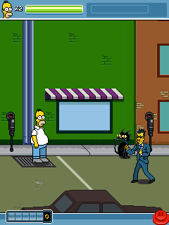 that's bad enough but almost everything else is missing too. you can only play as homer; there is only one enemy, a generic suit guy; none of the background characters or events are there; there are no pickups or throwable weapons; you're basically homer walking through a generic, lifeless city. it's kind of depressing to be honest, and it's made worse by the near total lack of sound. there are no SFX at all, not that unusual for J2ME games, but it's not like they were impossible. the occasional “woo-hoo!” when you pick up an extra life really would have improved things. and musicwise, all you get is a middling MIDI rendition of the main theme which plays on the menu on a loop, then plays one time whenever you pick up a health item. it's all very hollowing, tbh.