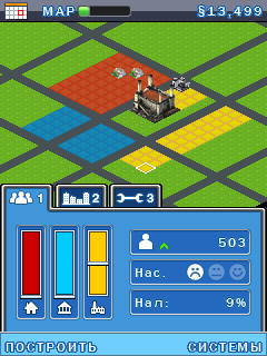 despite all these limitations, the port team - “EA Mobile Montreal Team” - made sure to include the crucial elements. the basic RCI meters are here; population, happiness, tax rates, demand for various services. there are also natural disasters. this is all i know, because for some reason the game stopped running on the emulator. i can't make any sense of it, it worked fine for a couple hours when i first played it; now if i load it up, it just hangs as soon as i try to get into a game. i had to load up a russian version to get these screenshots, and i'm 99% sure it's been cut down to target some highly constrained phone platform, so there might be more to the game than i realize.