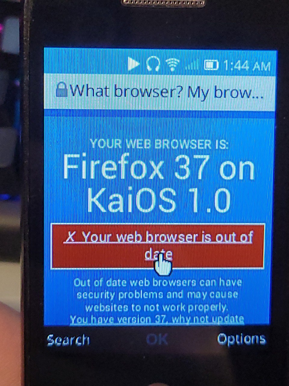 it was amazing that this thing just got online with no complaints. i guess it probably has relatively recent TLS support and certs, having come out in at least 2017 (based on the release date of KaiOS 1.0.) that said, firefox 37 came out in 2015, so… was it super outdated, were the version numbers inconsistent vs. desktop, or do i have my dates wrong? couldn't say.