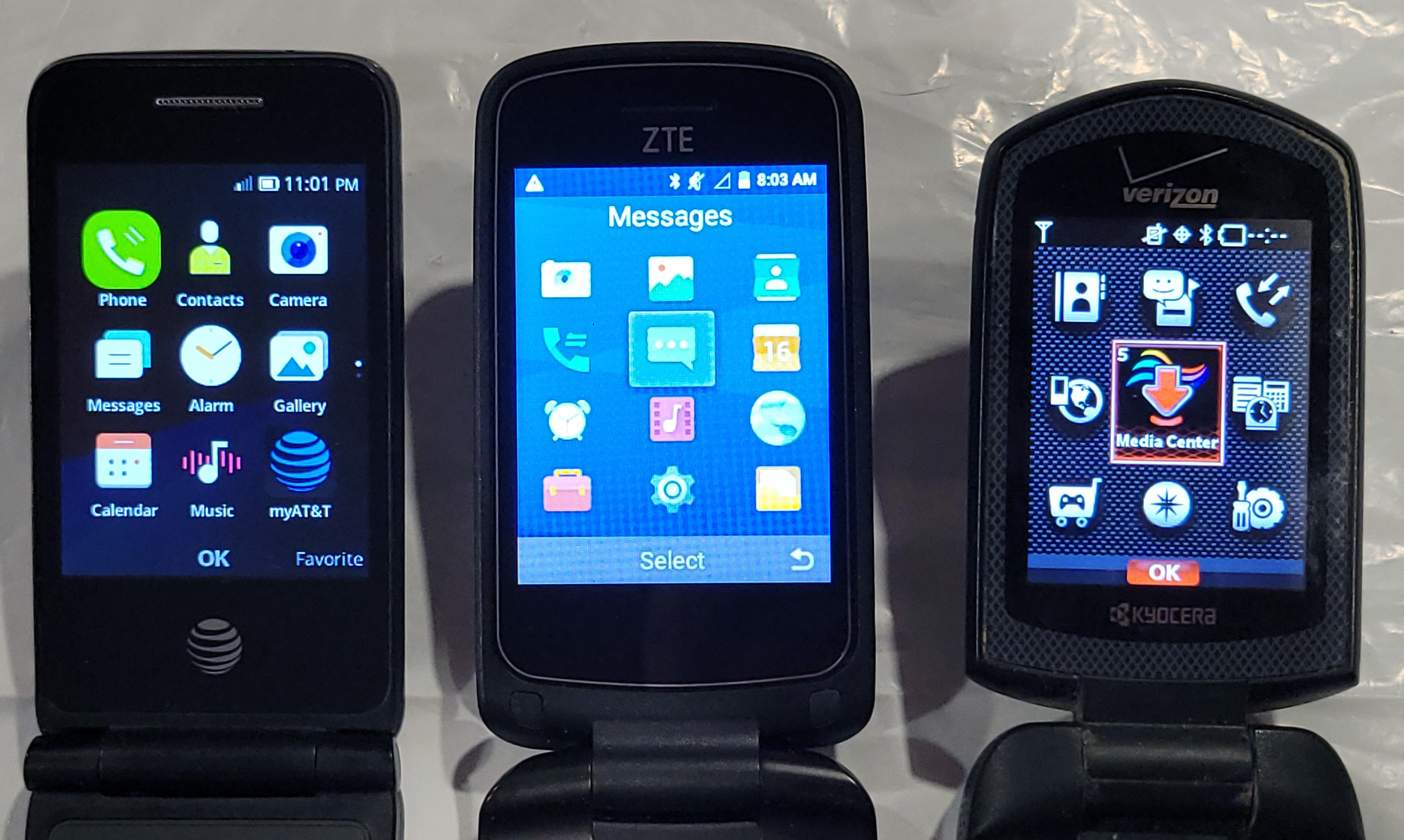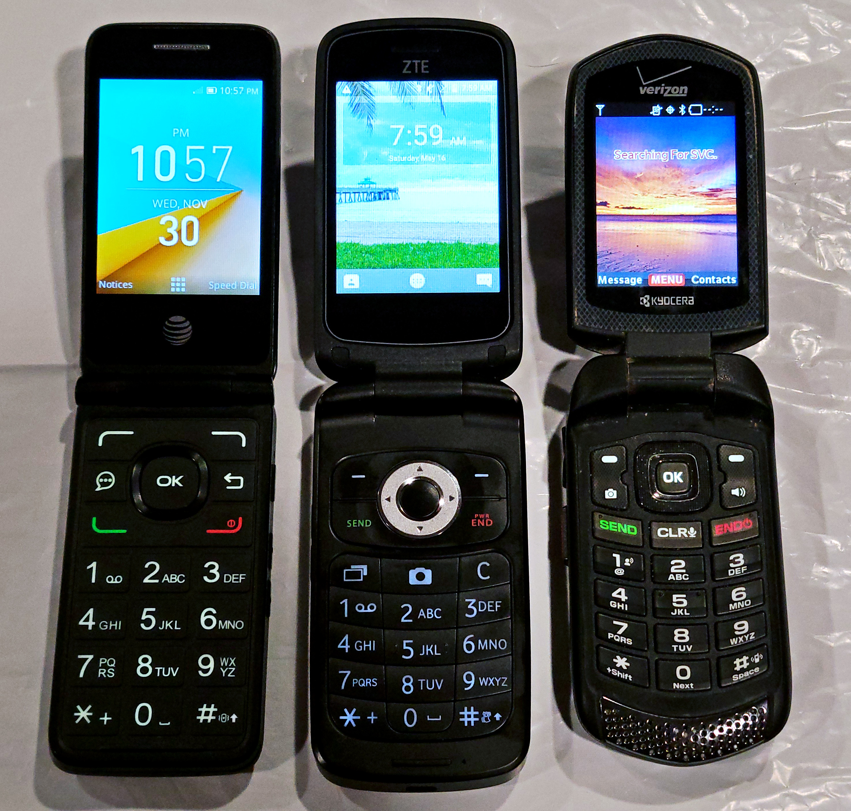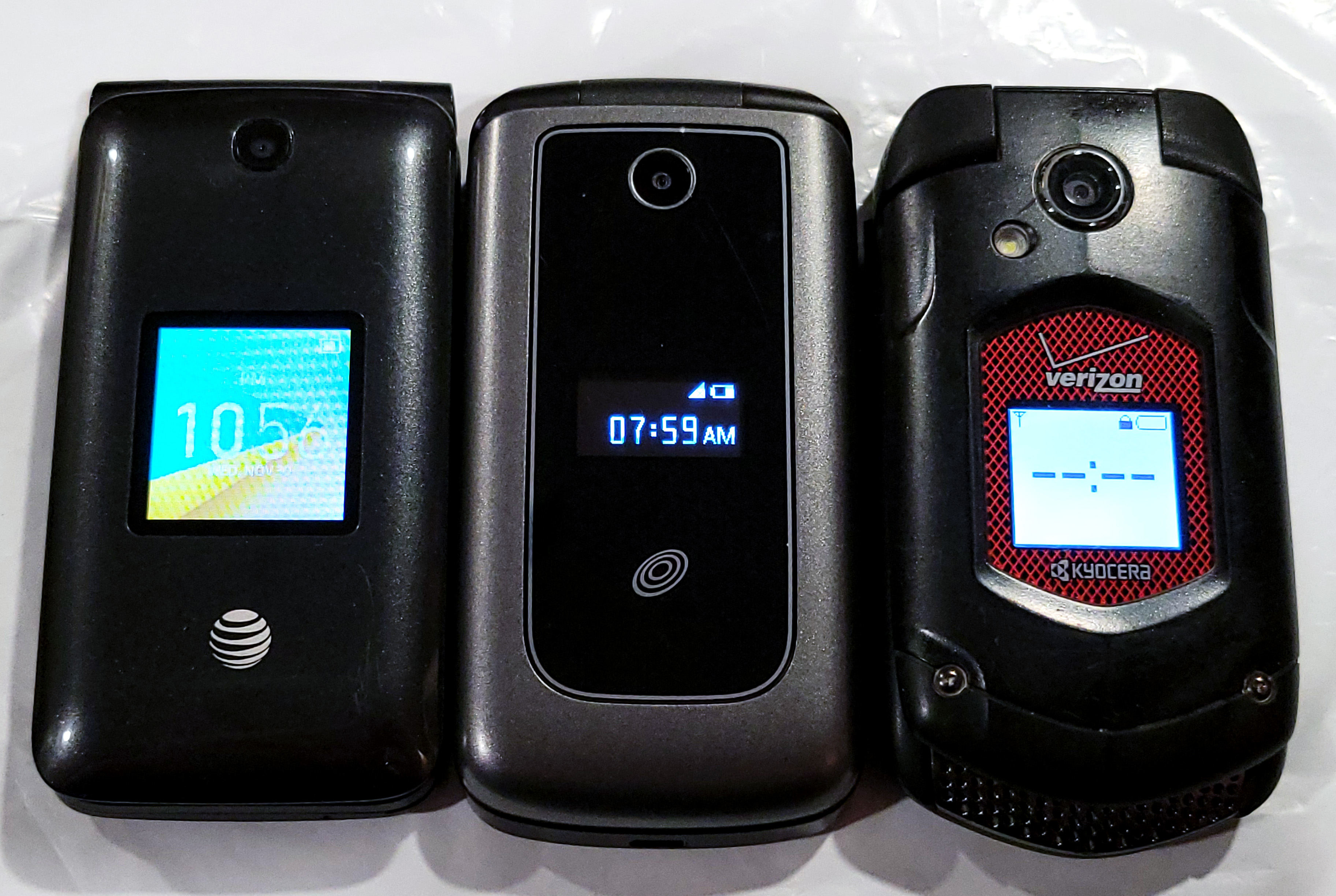from left to right, we have the Alcatel 40440, the ZTE Z233VL, and the Kyocera DuraXV e4520.