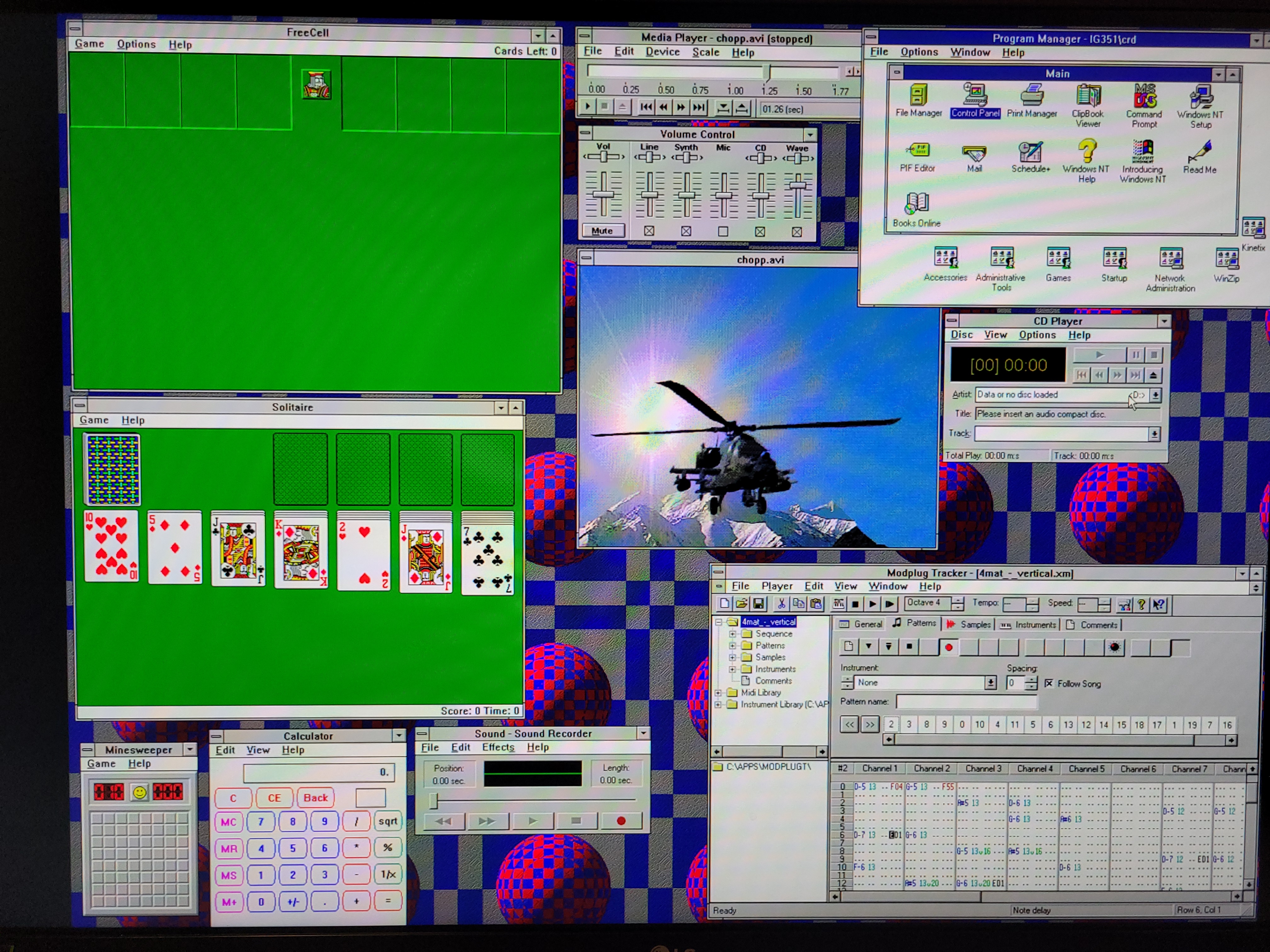 i don't happen to have a 1600×1200 CRT handy (mine are all at the office) and that's why i'm doing this on an LCD through a scaler, but otherwise this is a fairly authentic photo of a reasonable PC experience for 1995. imagine fitting all this crap on your screen at once! now mind you, the specs on this machine are a bit chubby for the era, it is a workstation-class system, so it has dual CPUs (hence NT) and 64MB of RAM, quite a bit for the time, but i doubt that much of that is even being consumed by these particular apps, short of maybe the video player. and it's usable! it doesn't really feel weird after a little bit! i mean, navigating between apps without a taskbar sucks, but what else is new, early GUIs were just trash in that regard. otherwise, it feels great.