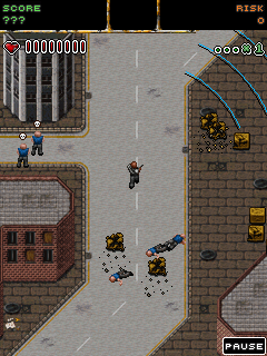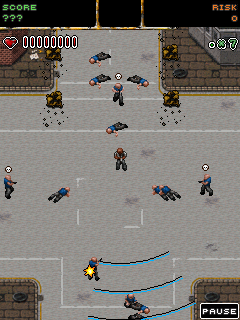 this one goes WAY further than most though. The Club was a third person shooter for PC/PS3/360 which I have never heard of in my life and am now kind of fascinated by, but as far as I can tell, the gameplay is largely conventional 3D shooting action. J2ME The Club on the other hand is a strange twist on a rail shooter: stages are played in top-down perspective, and at first you might think it's a Hotline Miamilike, but you have no direct character control! your boy moves on a predetermined path, and you can control how fast or slow he goes, and you can rotate his torso; that's it, otherwise you're just along for the ride.
