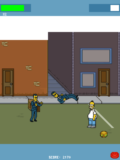 that's bad enough but almost everything else is missing too. you can only play as homer; there is only one enemy, a generic suit guy; none of the background characters or events are there; there are no pickups or throwable weapons; you're basically homer walking through a generic, lifeless city. it's kind of depressing to be honest, and it's made worse by the near total lack of sound. there are no SFX at all, not that unusual for J2ME games, but it's not like they were impossible. the occasional “woo-hoo!” when you pick up an extra life really would have improved things. and musicwise, all you get is a middling MIDI rendition of the main theme which plays on the menu on a loop, then plays one time whenever you pick up a health item. it's all very hollowing, tbh.