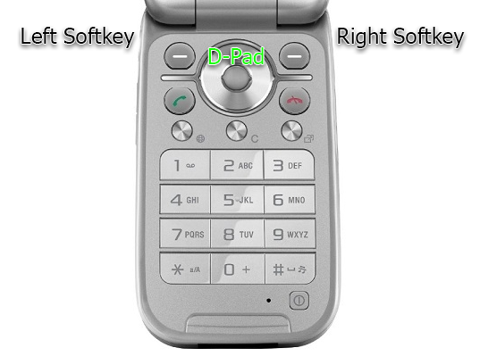 let's remind ourselves how flip phones are laid out. you have the dialpad, two Soft Keys which do whatever action is listed above them on the screen, and then a four-direction D-pad with a center button. there are often many other buttons, but none are universal, and are thus out of scope because no game will ever use them.