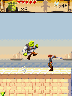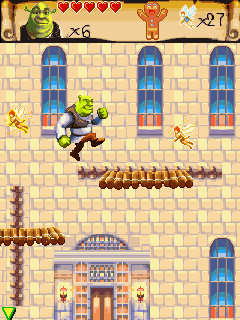 Shrek The Third The Movie The Game was clearly optimized for mass appeal, so it does this. left/right to move, up to jump, down to crouch (press while airborne to ground-pound; hold and press a direction while on ground to roll) and action to attack are the only inputs. there's nothing on the softkeys or *,0,# and you never need to hit two buttons at once. this is as simple as it could be, and yet you're still given tons of health, tons of grace time, tons of space to see and react to enemies, and in fact, the action button is optional.