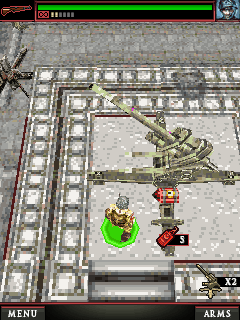 this is a straightforward, mobile-ized, casual-ized WW2 game. you move through streets, autotarget guys, shoot them, sometimes throw a grenade, and you are given tasks like “blow up the flak cannon.” it's nothing remarkable, you can easily imagine it shipping on the DS or something. the reason i bring it up here is twofold: one, the game's controls and AI are optimized well for flip phone awkwardness; you can move and attack with the D-pad, using just one hand, and not get killed because enemies give you lots of grace time to fire and they stunlock easily, so you could enjoy playing this while waiting for a bus even if your other hand was occupied holding a shopping bag. the other reason though is because it's incredibly performant.